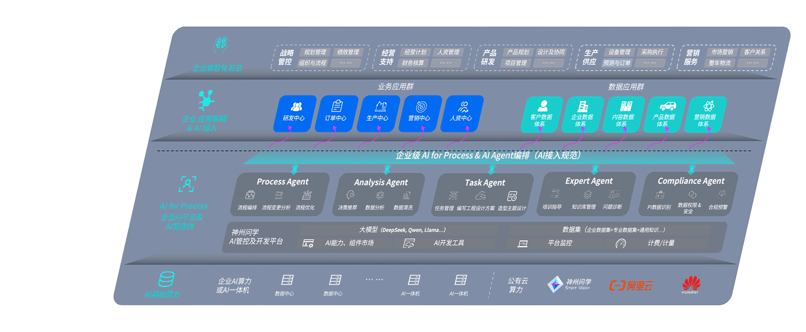 端到端的一站式AI工作空间深度融合了从企业战略规划到日常经营的全流程业务板块,,,定向解决车企内部领域多、、、部门多、、、、链条长、、场景碎片化等难题,,支持车企快速构建以AI为核心的生产力写作体系,,,,实现任务执行与AI能力的无缝集成与交互